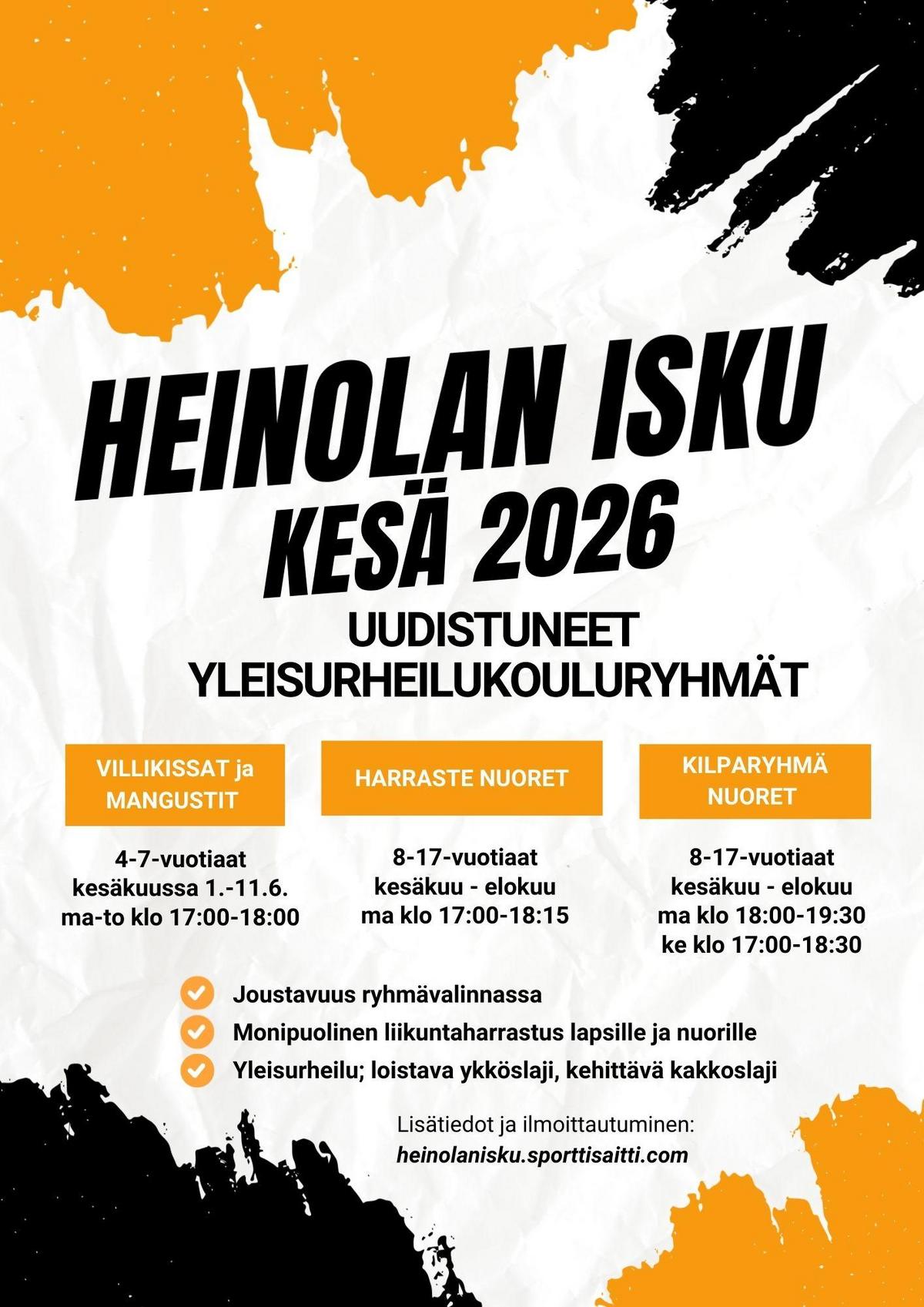 Haemme lasten yleisurheilutoiminnan vastuuohjaajaa Heinolan Iskun yleisurheilukouluun kaudelle 2026. Toivomme hakijalta kokemusta liikunnan ja lasten parissa toimimisesta, organisointikykyä sekä sitoutumista kerran viikossa tapahtuvaan toimintaan. Mahdollisuus on myös laajentaa työnkuvaa kilparyhmän valmennustoimintaan.